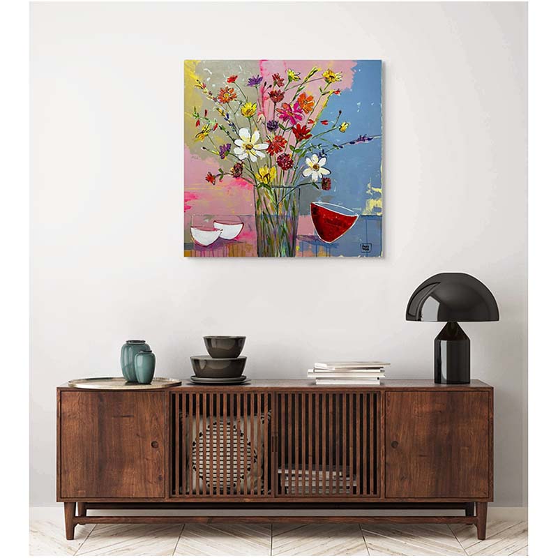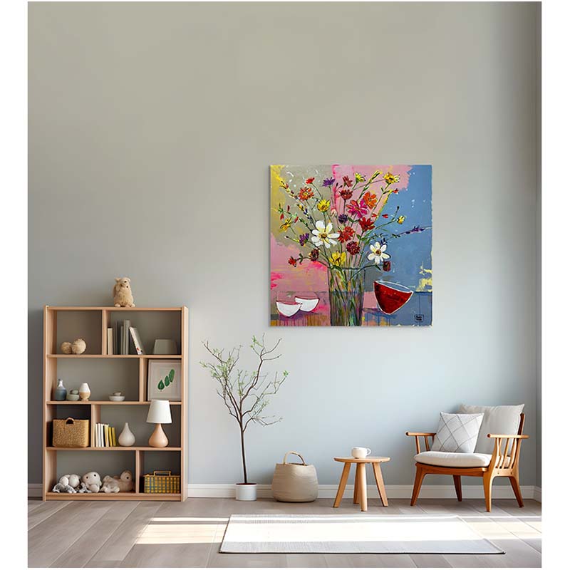 A vivid symphony of colour and life, where wildflowers burst from a glass vase with expressive spontaneity. Against a patchwork of pastel pinks, bold blues, and muted yellows, each bloom seems to pulse with emotion—delicate whites, radiant reds, and deep purples collide in a joyful, unrestrained bloom. The brushwork is both confident and intuitive, lending the piece a sense of movement, as if the flowers are swaying in an unseen breeze. Anchored by geometric hints of red and white vessels, the composition balances chaos and calm. It is a moment of everyday beauty, captured in vibrant, expressionist rhythm.