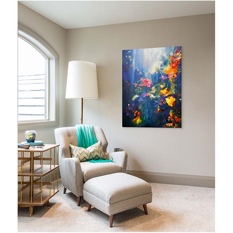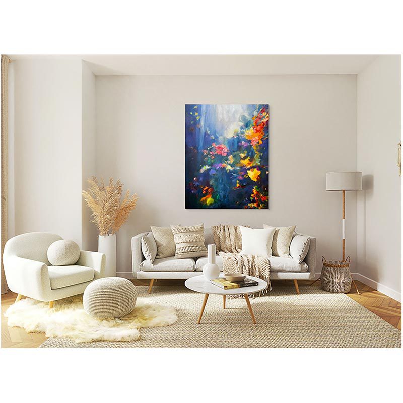 A dreamscape where light and shadow dance among blossoms. Swirls of deep indigo and sapphire anchor the canvas, while bursts of fiery orange, gold, and fuchsia seem to float and shimmer as though carried by a nocturnal breeze. The impressionistic brushwork captures both movement and stillness, evoking a secret garden alive under moonlight. It is a celebration of colour as emotion—lush, mysterious, and endlessly unfolding.