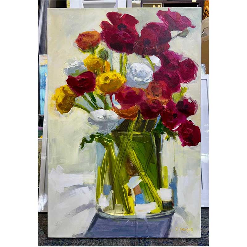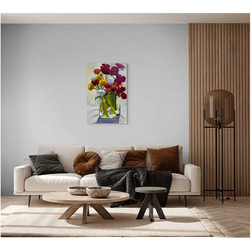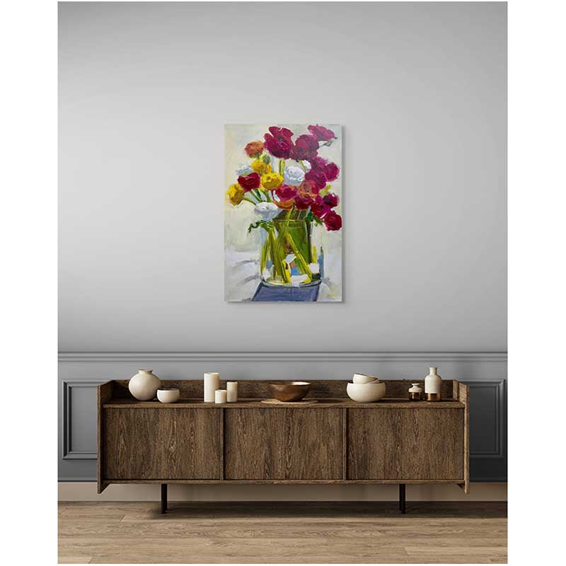 Let Spring Exclaim Loudly by Claudia Treagus is a joyful celebration of colour, gesture, and seasonal abundance. A vibrant bouquet bursts from a translucent green vessel, its crimson, gold, and white blooms painted with confident, expressive strokes. The looseness of the mark-making allows the flowers to feel alive—almost swaying—while the soft, neutral background gives space for their energy to resonate.