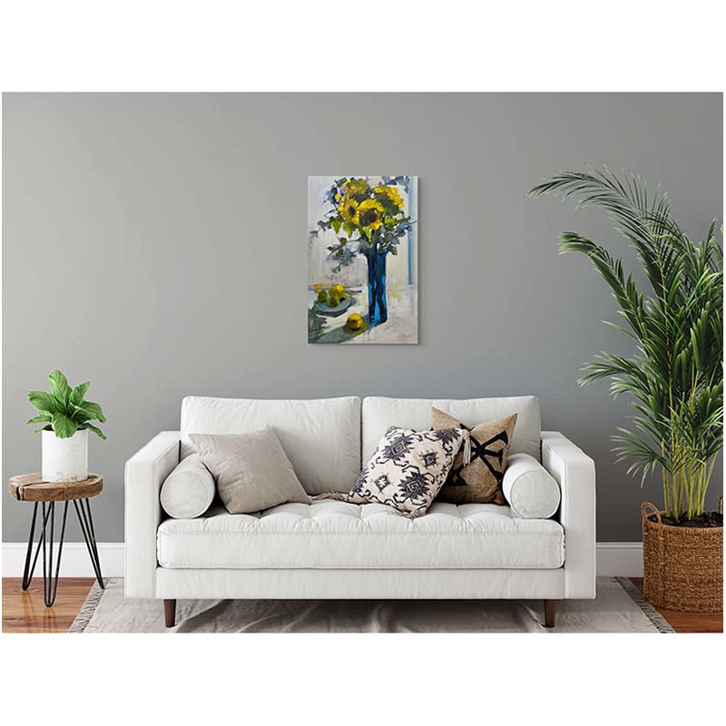 This expressive still life celebrates the vibrancy of sunflowers arranged in a striking cobalt blue vase. The bold yellows of the blooms contrast beautifully with the cool blue tones, creating a lively interplay of light and shadow.