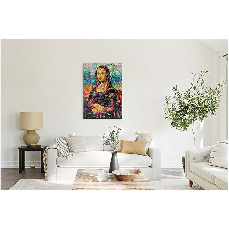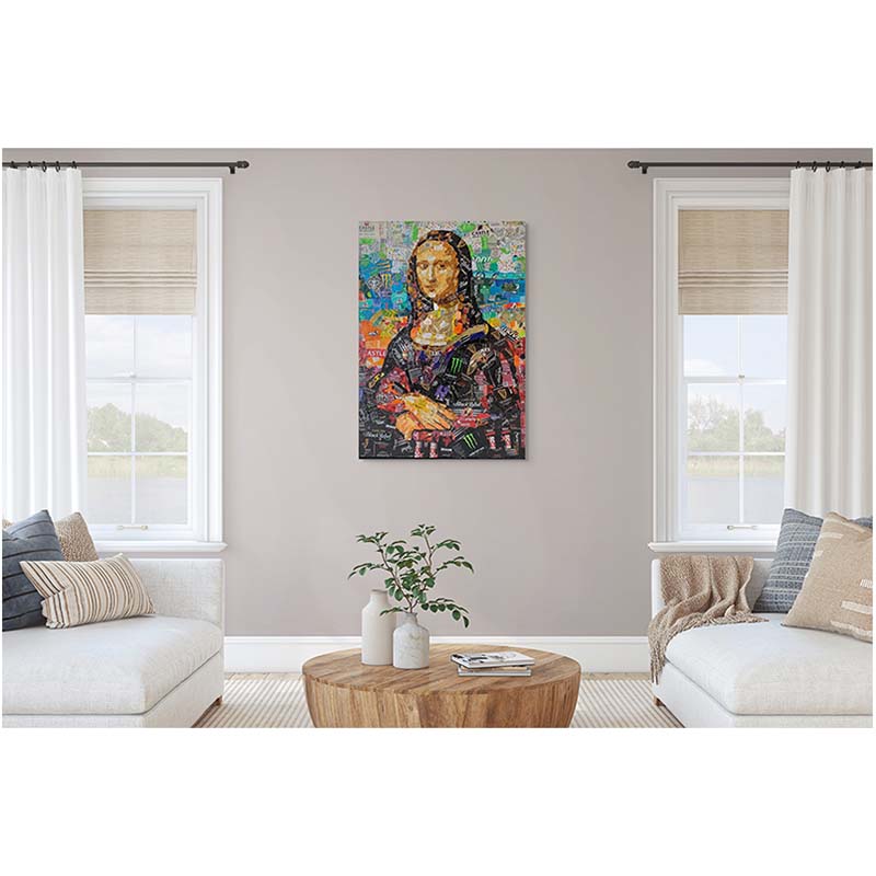 “Mona Lisa – In the Can” by Gavin Larkin is a contemporary reimagining of one of history’s most iconic portraits. Constructed from layered tin cans, the familiar figure emerges through fragments of modern consumer culture. Vibrant colour, texture, and recycled materials collide to contrast classical beauty with everyday branding. Bold and inventive, the work challenges ideas of value, fame, and how iconic images are consumed in the modern world.