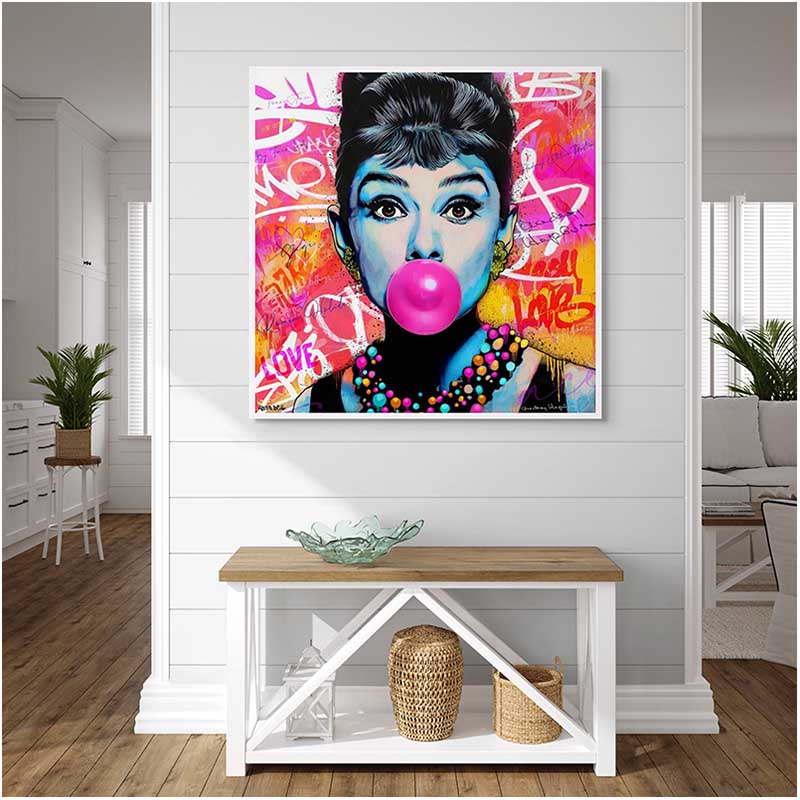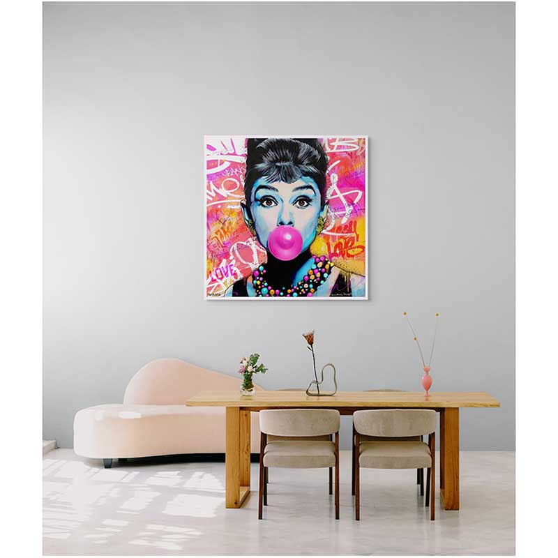 “Audrey Pops” is a bold pop-art homage that reimagines the iconic figure Audrey Hepburn through vibrant colour, graphic intensity, and playful irreverence. Rendered in electric blues, hot pinks, and saturated reds, the portrait is energised by expressive line work and layered urban markings that evoke street art and contemporary culture. The bubblegum becomes a central motif—symbolising youthful rebellion, glamour, and modern femininity—while handwritten words and splashes of colour add rhythm and movement across the surface. Striking and unapologetic, this work celebrates timeless style through a distinctly modern, pop-infused lens.