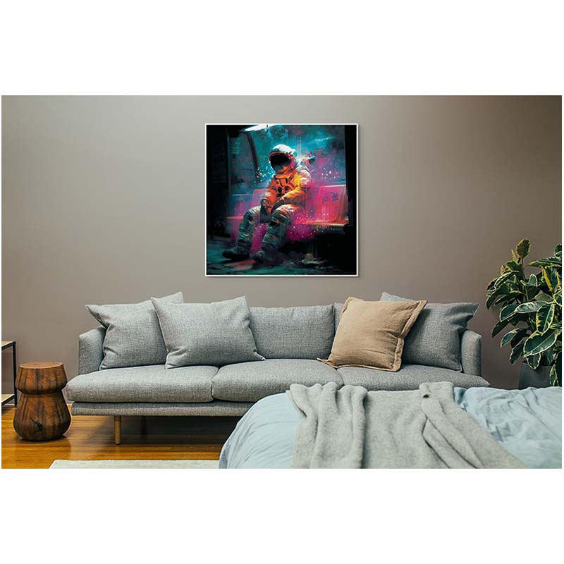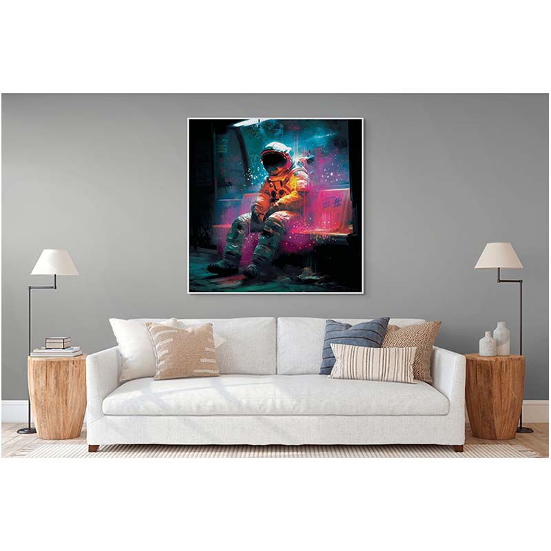 A lone astronaut sits in a glowing urban dreamscape, blurring the line between outer space and inner worlds. Bold, neon hues pull you into a surreal pause between realities.