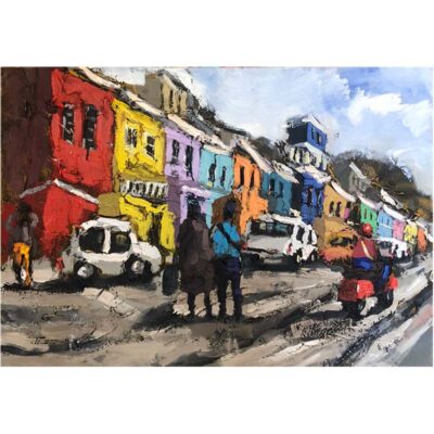 This vibrant painting by Patrick Rapai captures the spirit of Cape Town. The Bo-Kaap quarter is a colourful and lively place, and the vespa driver fits in with his blue helmet and vespa.